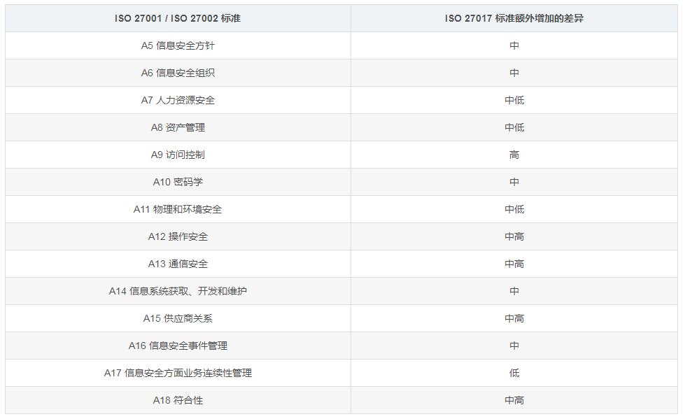 ISO 27001 / ISO 27002 標(biāo)準(zhǔn) ISO 27017 標(biāo)準(zhǔn)額外增加的差異